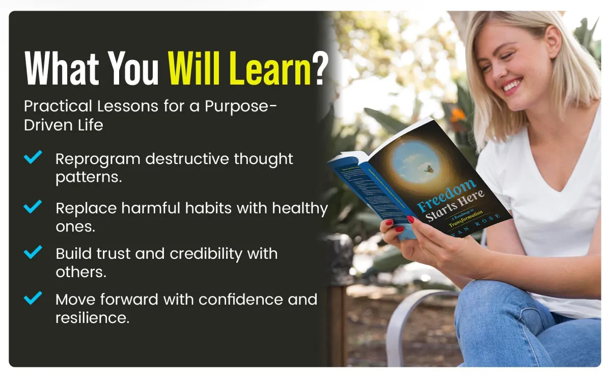 After reading Freedom Starts Here, it was like someone turning a light on in my head. I now understand that I wasn't taught how to manage my feelings, stop reacting, and hating myself. Now I am choosing who I want to be.”